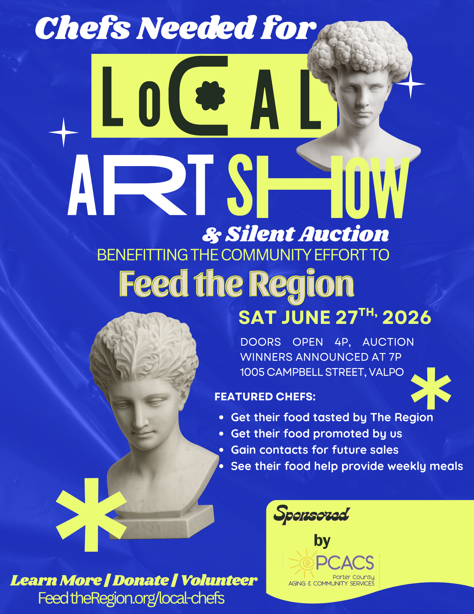 Whether you’re a professional Northwest Indiana chef or creating in your spare time, we’d love to feature your work in our Local Artist Art Show & Silent Auction that benefits Feed the Region.
